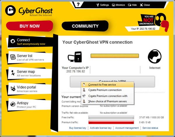 Untuk menyembunyikan IP anda, klik pada tombol bertuliskan "Connect to VPN" lalu pilih menu "Connect to Free service".